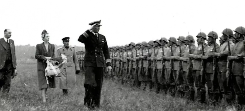Кронпринц Фредерик, кронпринцесса Ингрид с командующим советскими войсками на Борнхольме генерал-майором Коротковым обходят строй советских войск (Аллингё, июнь 1945 г.).