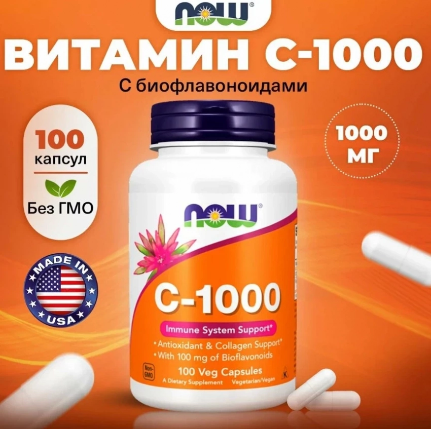 NOW C-1000, Витамин С с биофлавоноидами, 1000мг 100 растительных капсул, Антиоксидант для иммунитета для взрослых, способствуют лучшему усвоению других витаминов