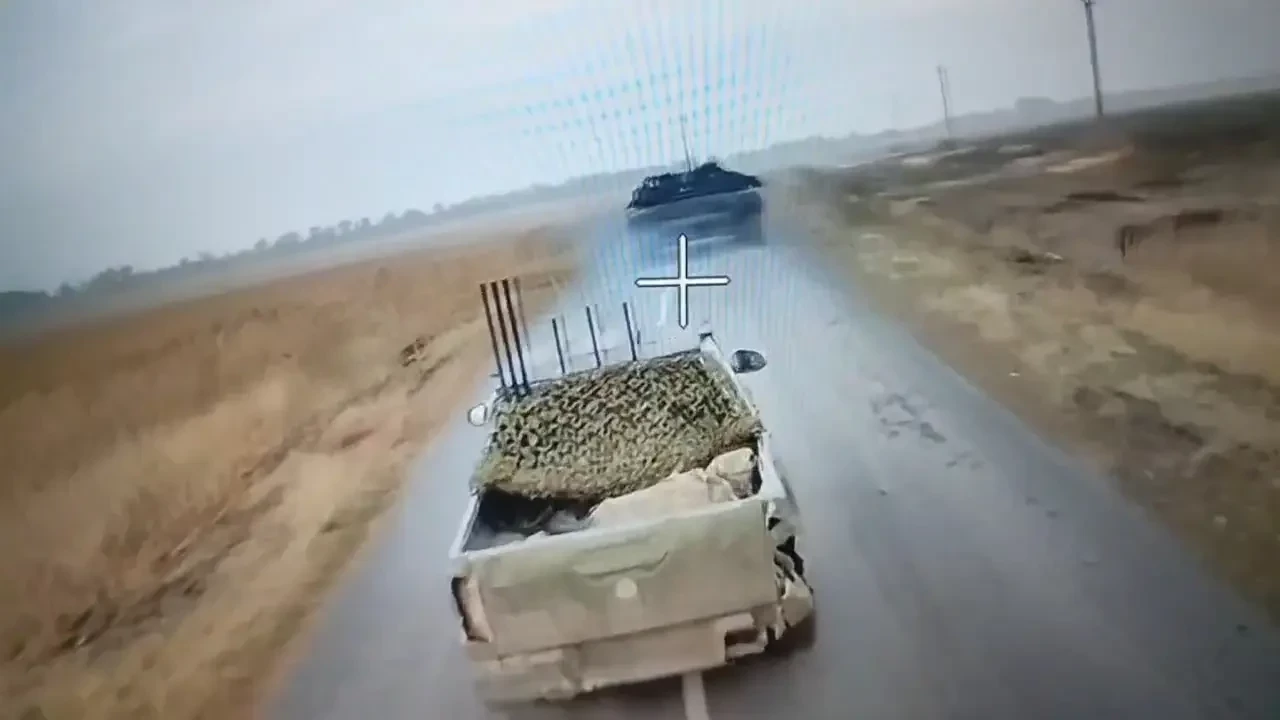 БПЛА с КВН преследует украинский пикап. Фото Telegram / BMPD