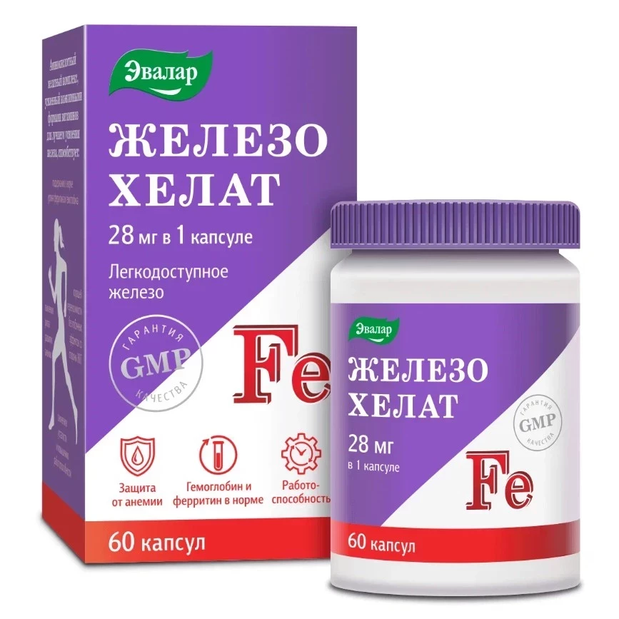 Железо хелат Эвалар — это высокоэффективная добавка, идеально подходящая для людей с дефицитом железа. Каждая капсула содержит 28 мг железа в хелатной форме, что способствует его легкому усвоению и предотвращает побочные эффекты со стороны ЖКТ. В добавке также присутствуют витамины С, В9 и В12, которые усиливают усвоение железа и поддерживают нормальный уровень гемоглобина. Это отличный выбор для людей, страдающих от усталости, головокружений и других симптомов анемии, а также для тех, кто ищет средство для повышения работоспособности и поддержания иммунной системы.
