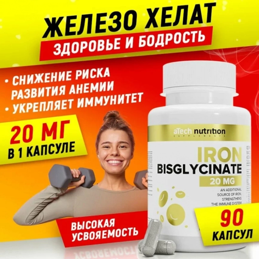 Железо бисглицинат (хелат) aTech nutrition БАД к пище 90 капсул