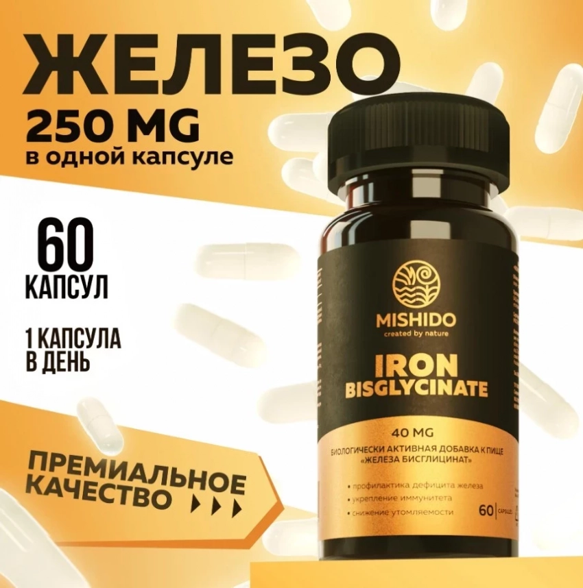 Железо хелат IRON BISCLYCINATE MISHIDO 60 капсул, витамин для повышения уровня гемоглобина