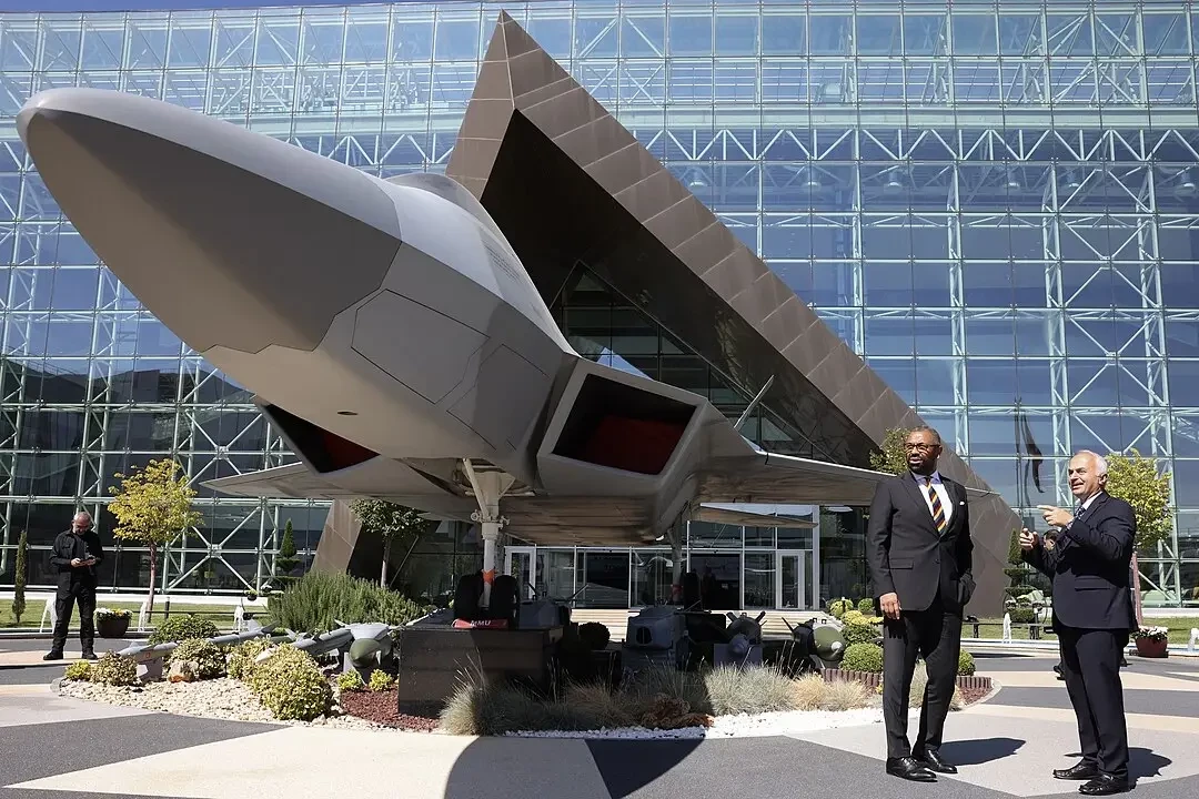 Министр иностранных дел Великобритании Джеймс Клеверли осматривает макет TFX-KAAN во время своего визита в штаб-квартиру Turkish Aerospace Industries в Турции (2023 г.)