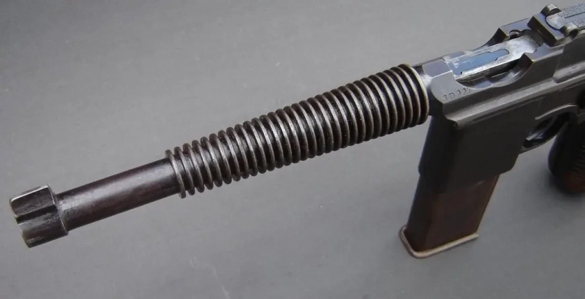 «Маузер» фирмы братьев Бейстегов. Вид слева. Внешне пистолет походит на обычный «маузер», но вот ствол у него заметно толще и вдобавок покрыт оребрением, которое расширяется к казенной части и явно служит для лучшего охлаждения ствола. Рычажок предохранителя находится над спусковым крючком, а вот над рукояткой имеется регулятор темпа стрельбы, соединенный с массивным грузом, закрепленным в рукоятке подвижно. Чем больше ход груза, тем меньше скорострельность, и наоборот. Решение простое, но остроумное.