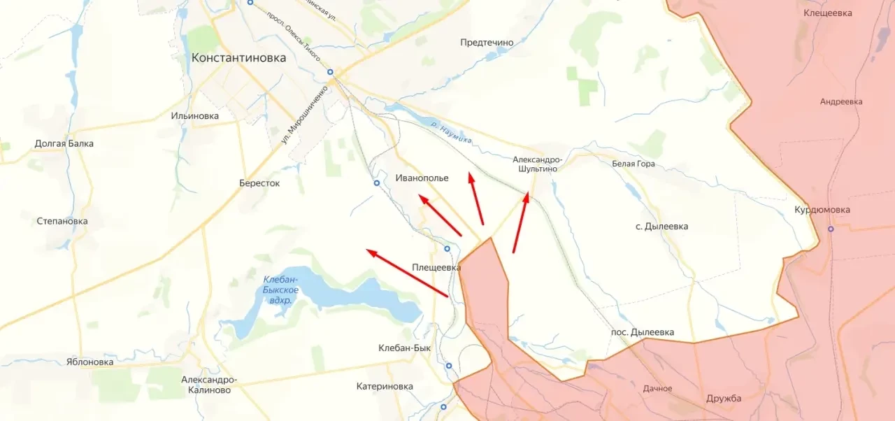 Так, наиболее сложная обстановка складывается в районе междуречья Солёной и Волчьей, где российские подразделения закрепились в Надеждовке и Успеновке, а теперь развивают наступление в сторону линии Русин Яр – Александро-Калиново. Это создаёт прямую угрозу Константиновке.