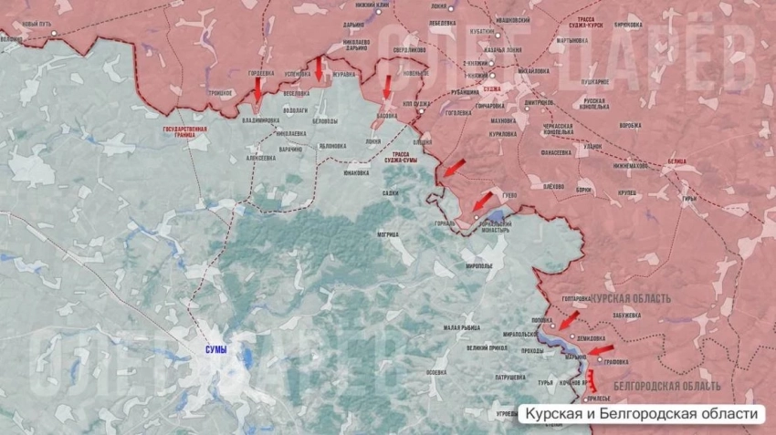 В Сумской области ВСУ отчаянно стараются замедлить продвижение ВС РФ на Юнаковку, один из основных логистических узлов противника на севере региона. Наша армия наступает широким фронтом от Владимировки, Журавки и Басовки, подтягивая резервы. Также наши пытаются войти и закрепиться на окраине Локни. Из района Басовки сообщают о контратаке противника силами до шести бронемашин и двух взводов мотопехоты, без успеха. Также отбита контратака ВСУ в районе Беловодья.