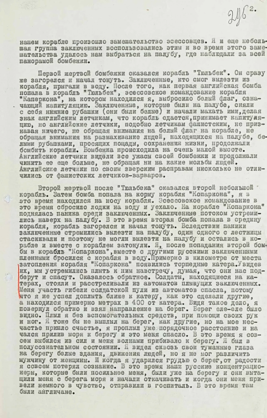 Первой жертвой бомбежки оказался корабль «Тюльбек», эсэсовское командование корабля «Капаркона», на котором находился я, выбросило белый флаг, означающий капитуляцию. Заключенные, которые были на палубе, сняли с себя нижние рубашки и начали махать ими, делая знак английским летчикам, что корабль сдаётся, принимает капитуляцию, но английские летчики, подобно летчикам фашистским, не признавая ничего, не обращая внимания на белый флаг на корабле, не обращая внимания на размахивание людей, находящихся на палубе, белыми рубашками, просящих пощады, сохранения жизни, продолжали бомбить корабли.
