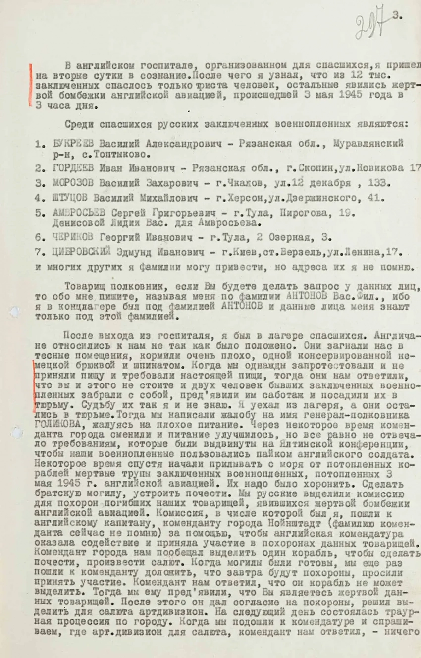 3 мая 1945 г. английские войска подошли к г. Нойштадту и предъявили капитуляцию городу к 12.00 часам дня. Город капитуляцию принял. После чего предъявили капитуляцию к 3 часам дня кораблям, на которых находились мы. Корабли находились в 6 км от города Нойштадт. Эсэсовское командование кораблей капитуляцию отклонило. Тогда вылетает английская авиация в большом количестве самолетов и начала бомбить корабли, на которых находились мы. Корабли, на которых находились мы, не сделали ни одного ответного выстрела по самолетам английской авиации. Всю панораму бомбежки английской авиации я наблюдал лично. Во время бомбежки на нашем корабле произошло замешательство эсэсовцев. Я и еще небольшая группа заключенных воспользовалась этим, и во время этого замешательства удалось нам выбраться на палубу, где наблюдали за всей панорамой бомбежки.