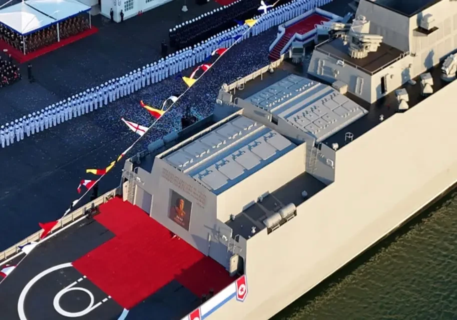 Вид на корабль с кормы, видна часть вооружения, включая крышки кормовых УВП, барельеф генерала Чхве Хён и двери в ангары для беспилотников