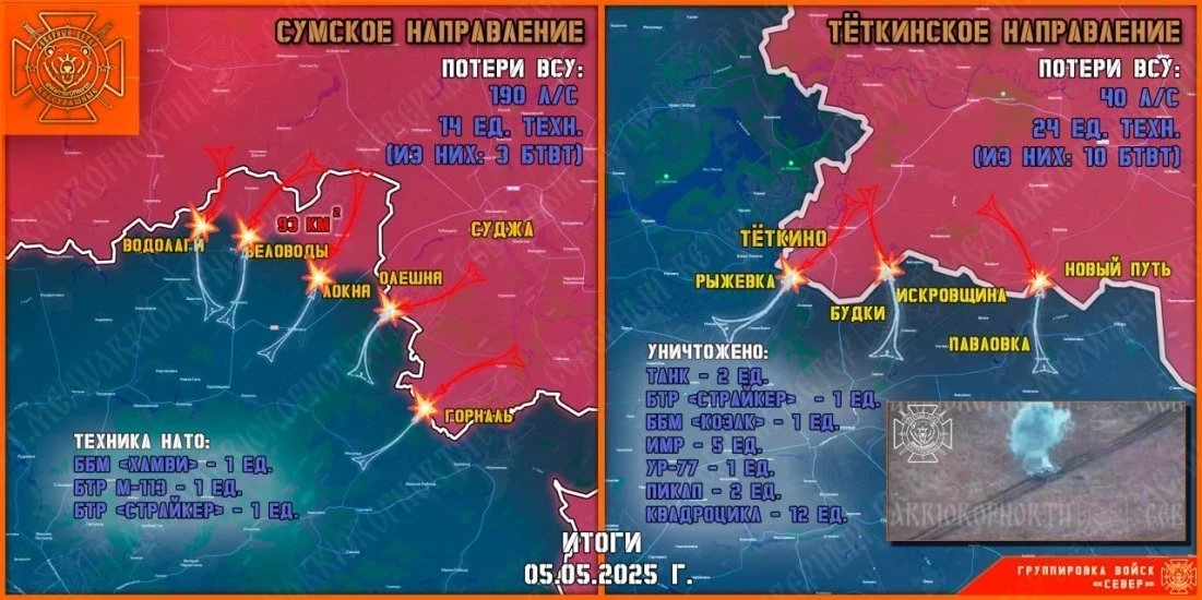 5 мая украинские боевики вновь попытались прорваться в Курскую область малыми группами при поддержке тяжелой военной техники в сторону населенного пункта Теткино. По сообщениям военкоров, ВСУ предприняли три попытки, каждый из которой не принесла желаемого результата.