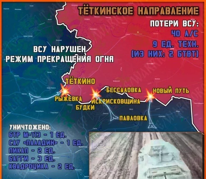 ВС РФ нанесли удар по группе украинских военнослужащих, пытавшихся проникнуть в поселок Теткино Курской области, сообщил военный корреспондент Борис Рожин в своём Telegram-канале.