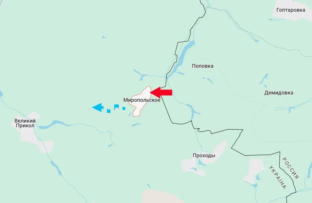 От Миропольского ВСУ вынуждены отходить западнее – в направлении населённого пункта с интересным названием Большой (Великий) Прикол. Тот случай, когда «прикол» действительно большой – ВСУ шли на территорию Белгородчины, а теперь командованию приходится латать дыры по направлению к Сумам. От Миропольского до областного центра около 29 км.