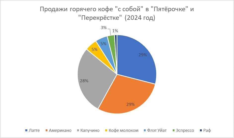В категории горячего кофе «с собой» клиенты «Пятёрочки» и «Перекрёстка» чаще выбирают американо, латте и капучино – на них приходится большая часть продаж. Меньше всего россияне любят раф, флэт уайт и эспрессо.