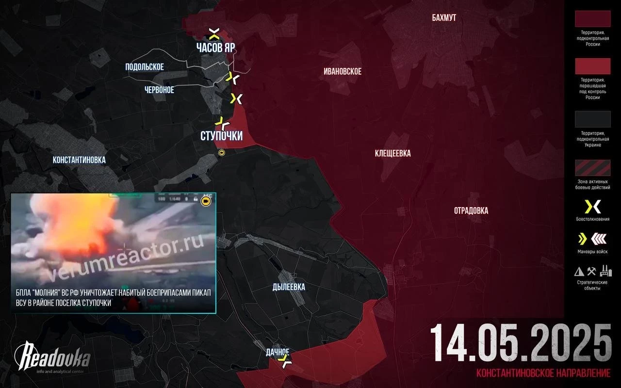Западнее Торецка ВС РФ продолжают наращивать давление со стороны Новооленовки и Александрополя на Яблоновку и в сторону Зари. Возможно, наши части постараются продвинуться вдоль дороги на Константиновку, чтобы обойти Клебан-Быкское водохранилище с севера и ударить во фланг подразделениям ВСУ, которые контролируют здешние высоты. Упорные бои идут в Старой Николаевке и на окраинах Романовки. Тактические изменения есть к северу от Торецка, хотя противник постоянно контратакует, замедляя наши атаки.