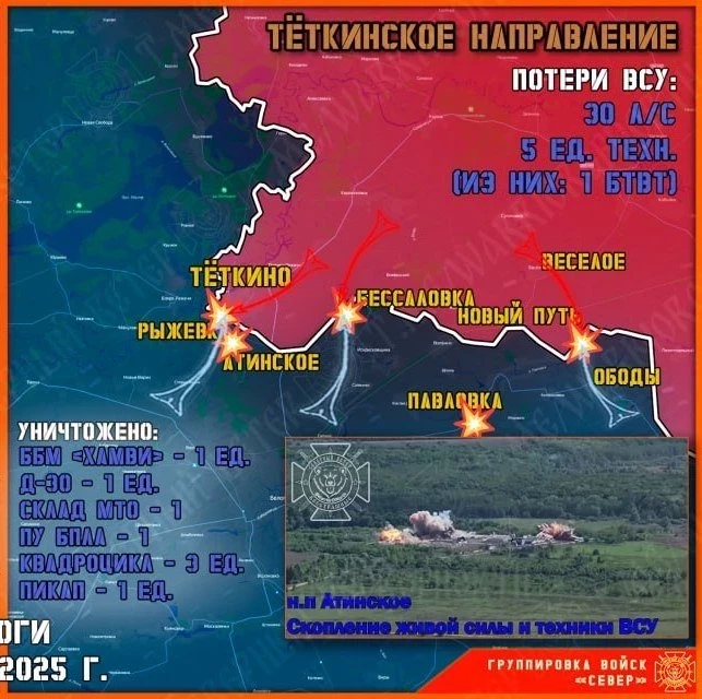 Накануне группировка войск "Север" уничтожала передовые и штурмовые подразделения противника на Тёткинском и Глушковском направлениях, продолжила создание полосы безопасности в Сумской области.