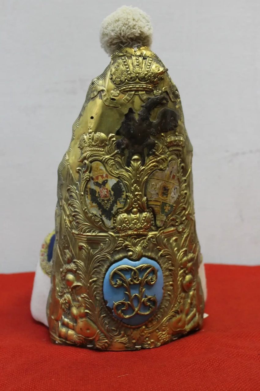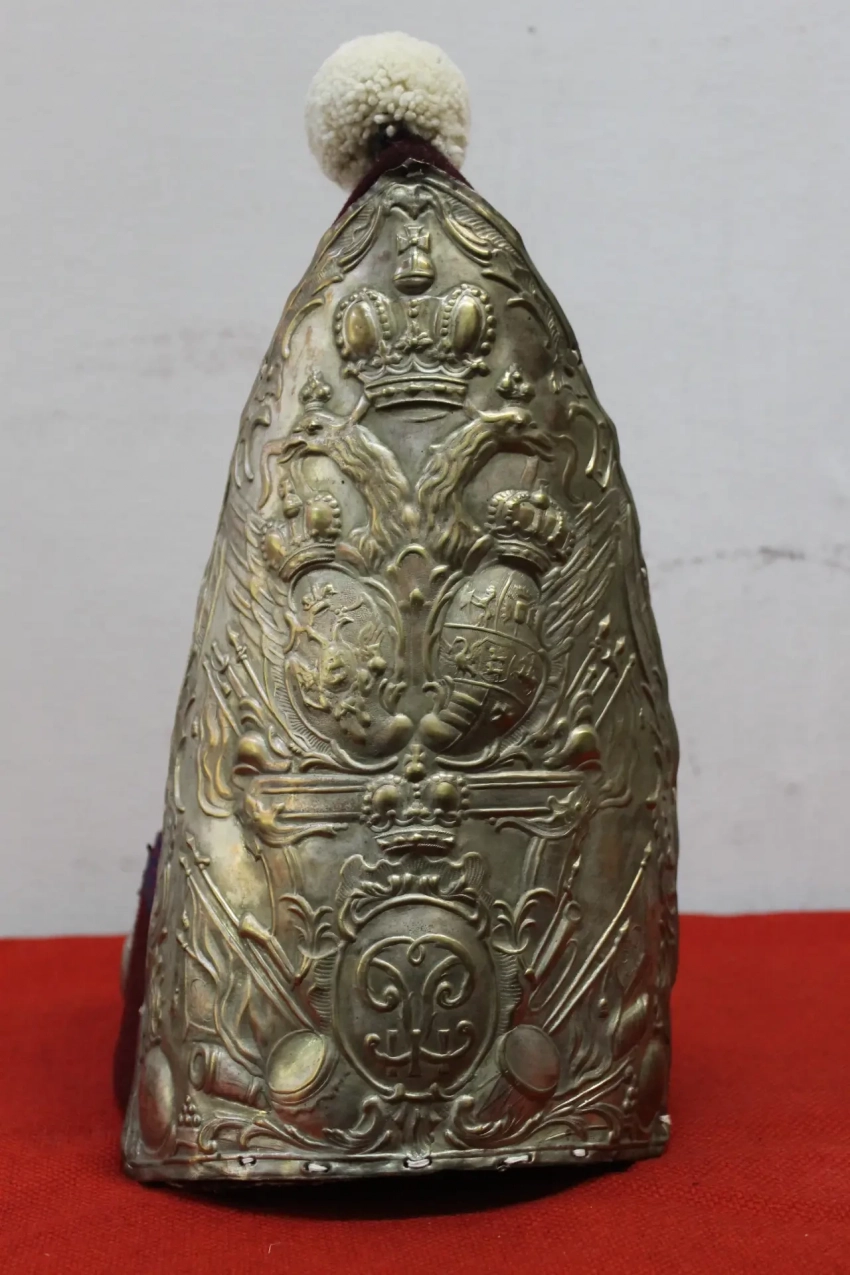 Митра офицера конных гренадеров Лейб-драгунского полка Гоштинской гвардии Петра III. Ткань, дерево, бронза, золочение, эмаль, краска. Диаметр основания 191 мм. Высота 297 мм. Материалы: сукно, дерево, бронза, позолота, эмаль, краска. Особенностью ее оформления являются целых три герба! Двуглавый орел в верхней части и два герба под ним. Российский справа, и герб Петра III - наследственный голштейн-готторпский герб слева. Внизу новый вензель – одна буква «П» на голубой эмали. Наверное, это самая красивая митра за всю историю их использования в российской армии. Пензенский областной краеведческий музей. Фотография автора