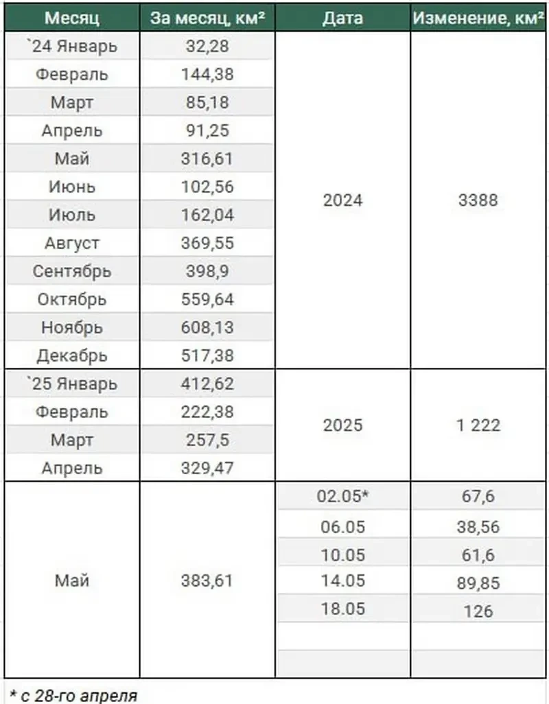 Согласно подсчетам, за первые четыре месяца 2025 года российские войска освободили территорию площадью 1222 кв. километра, тогда как за весь 2024 год — 3388 кв. км.