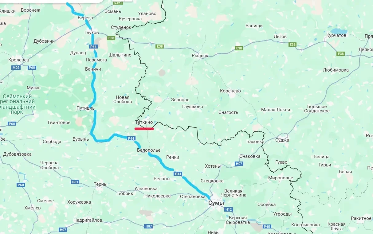 До этой дороги, например, от курского Тёткино, менее 8 км. Противник потому и продолжает биться в направлении Тёткино, чтобы не позволить нашим войскам войти в Сумскую область на этом направлении и лишить ВСУ важнейшей транспортной связи на северо-востоке Сумской и востоке Черниговской областей.