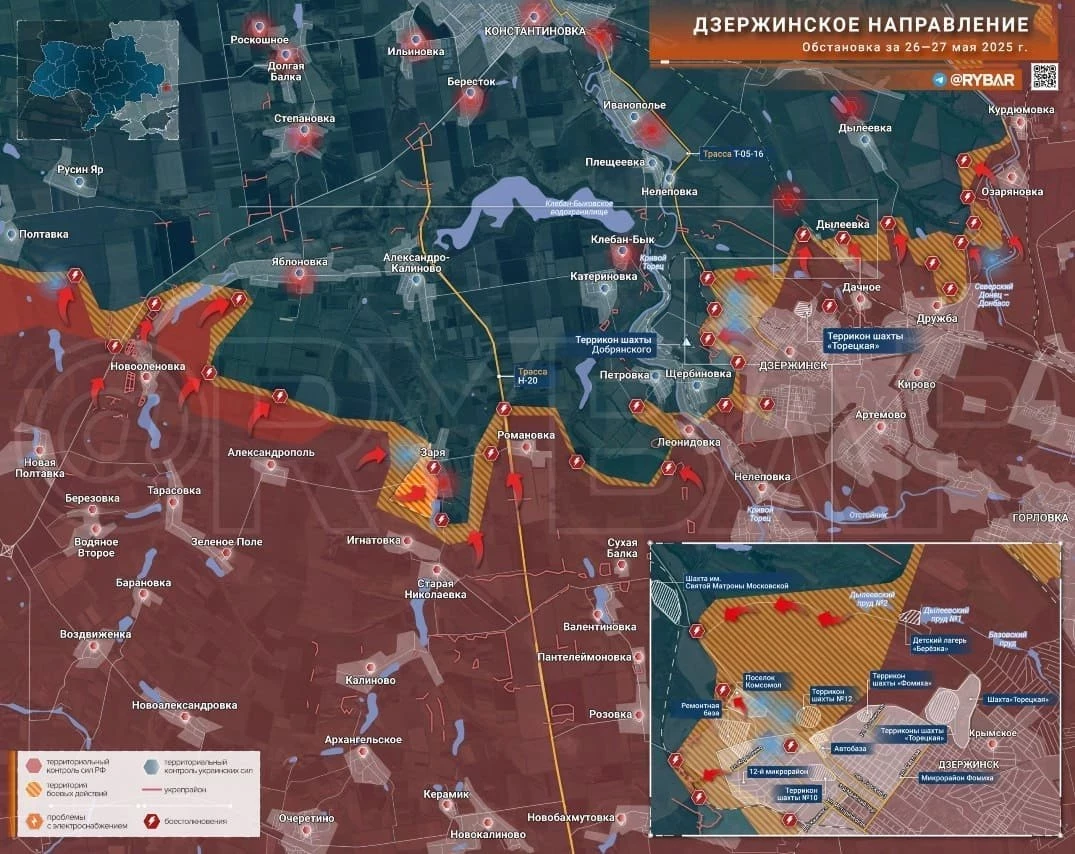 На Дзержинском направлении бойцы штурмуют Яблоновку, расширили зону контроля севернее Алексадрополя и ведут бои в Заре, расположенной западнее трассы Н-20, пишет Telegram-канал "Рыбарь".