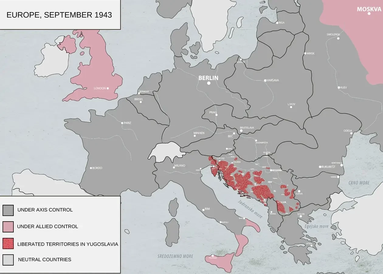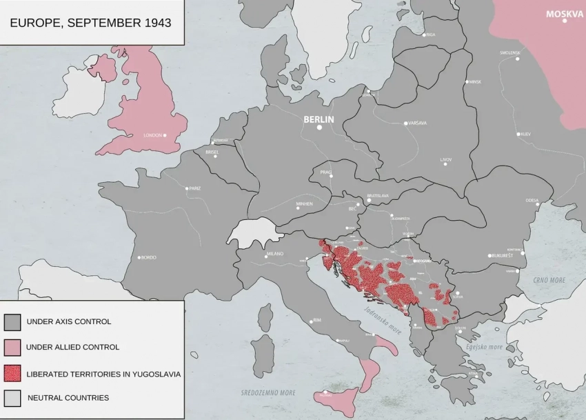 25 марта 1941 года регент Павел подписал протокол о присоединении Югославии к Тройственному пакту и уже через два дня был отстранен от власти офицерами во главе с генералом Симоновичем. Армии Германии и союзников Рейха атаковали Югославию и за несколько дней (с 6 по 11 апреля 1941 г.) разгромили ее войска. Сербы и черногорцы начали партизанскую войну, посмотрите, какую территорию контролировали их отряды в сентябре 1941 года: