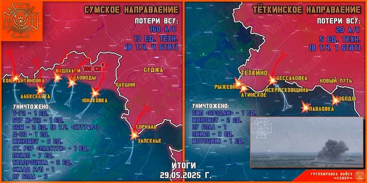 Вооружённые силы Украины (ВСУ) вновь и вновь пытаются прорваться на территорию Курской области. Как и прежде, своей первоочередной целью они ставят населённый пункт Тёткино, располагающийся рядом с государственной границей. Свежие новости и карта боевых действий в Курской области - в материале N4k по данным на 30 мая 2025 года.