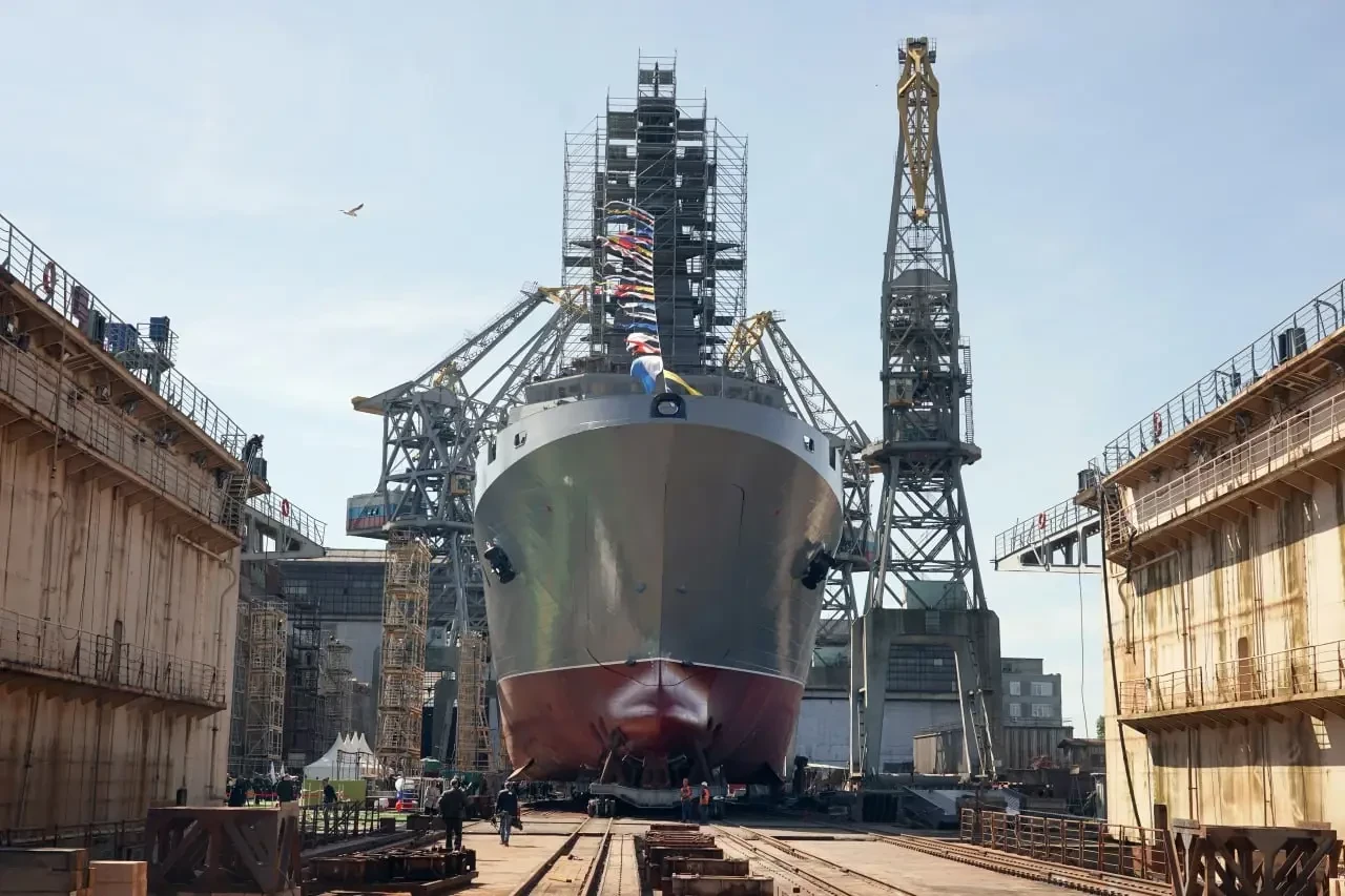 Большой десантный корабль «Владимир Андреев» усовершенствованного проекта 11711, построенный на Прибалтийском судостроительном заводе ОСК «Янтарь» для Военно-Морского Флота России, спущен на воду в Калининграде.