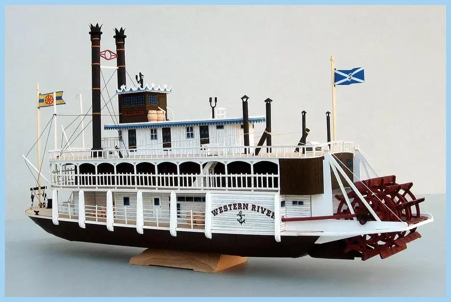 А вот это сборная модель «парохода Тома Сойера» из детевянных деталей одной из итальянских фирм, явно выпущенная на основе чертежей из польского журнала. И вроде бы все хорошо, но… погиб корпуса есть, но где соответствующая погибь палуб, причем как продольная, так и поперечная? То есть, упрощена она до предела, достаточно сравнить ее с тем же пароходом «Мариевилль»…