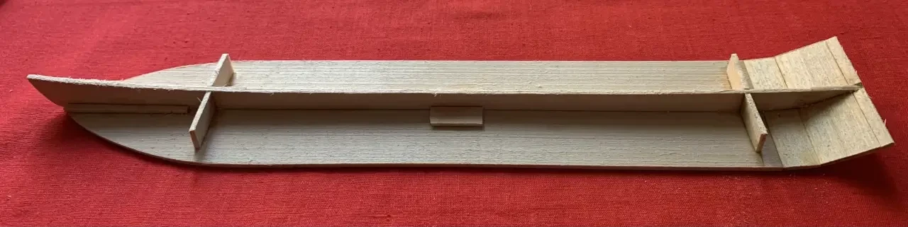 Корпус по парафиновой матрице выклеивается из папье-маше (размоченной в воде газетной бумаги), после чего укрепляется поперечными распорками и оклеивается «досками» — полосками шпона или же рейками толщиной 1,5–2 мм. Учтите, что погиби на нем нет, и ее нужно будет подрезать либо модельным ножом, либо сточить наждачной бумагой.