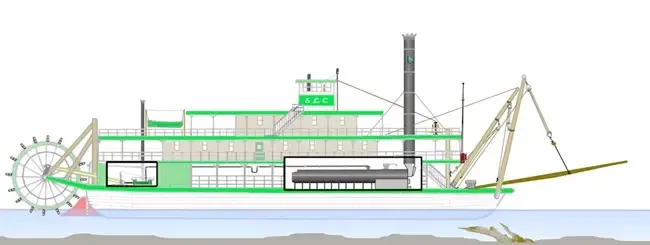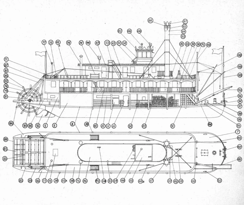 Пока же давайте рассмотрим устройство этих необычных судов. Хотя мы уже рассказывали о них, используя отрывки из книг Марка Твена и Майн Рида, есть смысл обратиться к… чертежам и посмотреть на них не только снаружи, но и изнутри.