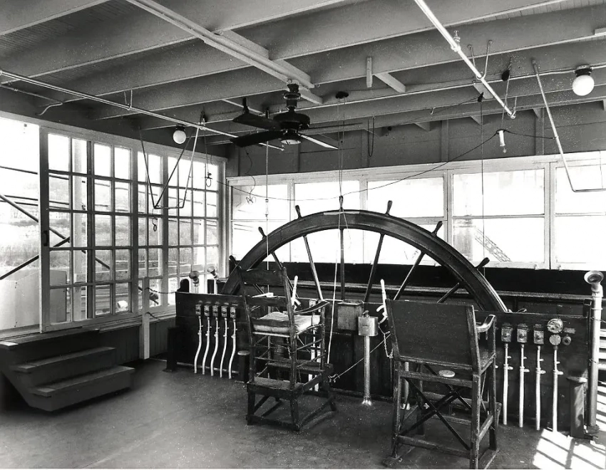 Капитанская рубка с прямо-таки огромным штурвальным колесом. От него тросы шли к двум или четырем рулям на корме, которые устанавливались перед гребным колесом