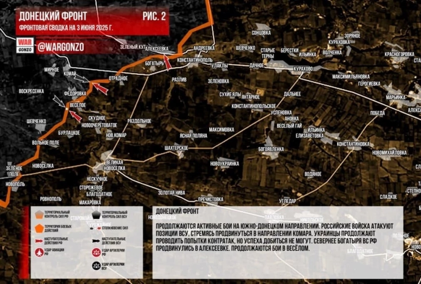 Продолжаются активные бои на Южно-Донецком направлении. Российские войска атакуют позиции ВСУ, стремясь продвинуться в направлении Комара. Украинцы продолжают проводить попытки контратак, но успеха добиться не могут. Севернее Богатыря ВС РФ продвинулись в Алексеевке. Продолжаются бои в Весёлом.