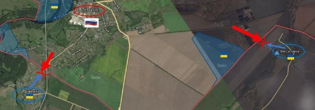 На Сумском направлении вчера в районе полудня штурмовые группы 225 ошп пытались просочиться на территорию Курской области из с. Бессаловки (Сумская область). Противник был обнаружен и с помощью наших артиллеристов и операторов БпЛА, уничтожен. Уцелевшая часть оккупантов отступила в обратном направлении. Утром силами неонацистов ВСУ попытались прорваться на территорию с. Теткино уже из с. Рыжевки (Сумской район). Наши воины в результате комплексного огневого поражения уничтожили большую часть оккупантов, остальные бежали вглубь Сумской области.