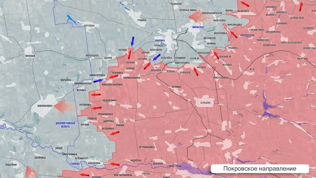 Также сообщается об успехах ВС России и на других направлениях. Как утверждается, была прорвана оборона ВСУ южнее Константиновки, с занятием сел Старая Николаевка и Гнатовка. На Новопавловском участке российские подразделения продвинулись к окраинам села Комар и установили частичный контроль над Федоровкой.