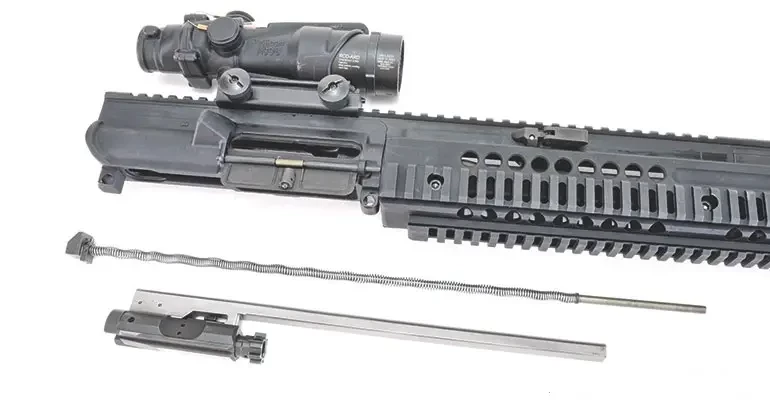 В AR, как мы знаем, ствольная коробка разделена на две части (верхний ресивер и нижний ресивер), в верхнюю ввинчивается ствол с патронником, и там же находятся направляющие для затвора. В нижней находится шахта магазина, все нужные кнопки, ударно-спусковой механизм с предохранителем-переводчиком и буфер отдачи вместе с управляющей рукояткой, которая, кстати, тоже заменяется, как и приклад. А поскольку соединяются оба ресивера между собой на штифтах, компоновку винтовки легко менять. Потому-то ее и называют «Лего» для взрослых». И это, кстати, способствовало ее популярности.