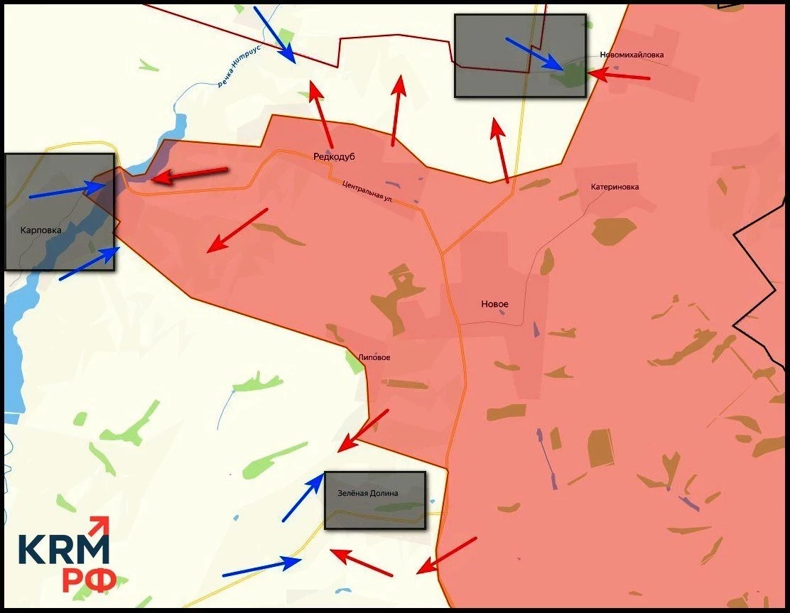 На Сумском направлении сложная ситуация фиксируется на линии Новониколаевка-Варачино-Яблоновка-Юнаковка. Российские войска закрепляются в этих населенных пунктах, несмотря на разрушения, особенно заметные в Юнаковке. Продвигаясь восточнее Локни, ВС РФ прощупывает направление к Садкам, заходя в лесной массив - что делает их вытеснение крайне затруднительным. Техника используется минимально: ставка делается на пехоту и массированное применение дронов. Именно через удары беспилотниками осуществляется дезорганизация логистики и позиций ВСУ, что, по сути, парализует оборону и коммуникации.