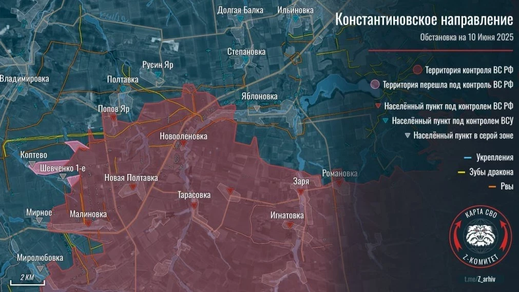 На Константиновском направлении ВС России развивают наступление к Клебан-Быкскому водохранилищу с запада и востока. Идёт штурм Яблоновки, Александро-Калиново.