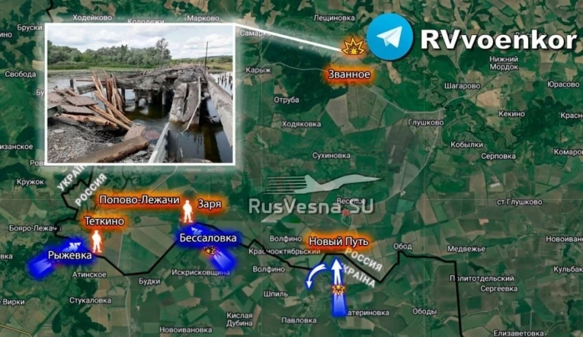 Информацию об украинских попытках вторжения в Курскую область подтверждает также Telegram-канал "Военкоры Русской Весны". Он уточняет, что враг продолжает пытаться изолировать плацдарм у Тёткино: ВСУ ударили по мосту в Званном, чтобы затруднить переброску наших подкреплений