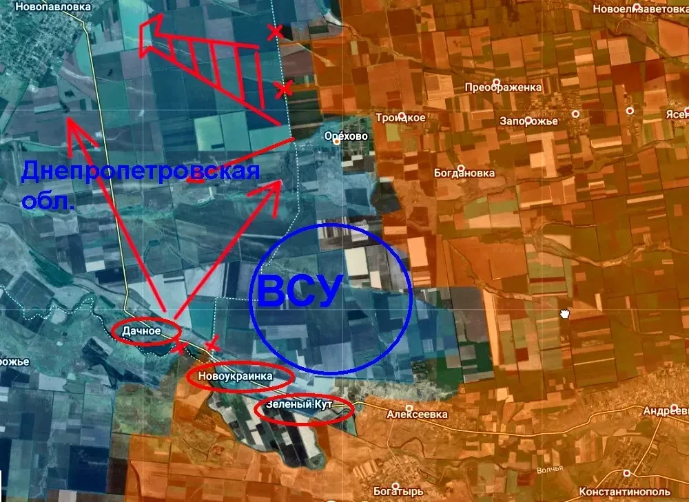 Украинский политолог Андрей Золотарев утверждает, что в Днепре (Днепропетровске) нарастают панические настроения. От точки захода российской армии в регион, по его словам, 176 километров или 2,5 часа езды до областного центра. Огромное расстояние по меркам СВО, но после вчерашней ситуации в районе Новоукраинки и Дачного, когда ВСУ потеряли «глубину» обороны примерно в 4-5 км за считанные часы, кто знает, как может развиваться ситуация в дальнейшем и за какое время ВС РФ смогут преодолеть указанное расстояние до Днепра.