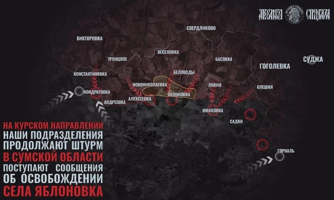 На Сумском направлении российские бойцы освободили н.п. Яблоновка в Сумской области. Подразделения ВДВ продолжают продвигаться в Юнаковке и в лесном массиве около Яблоновки. Мотострелки ведут ожесточенные бои в Новониколаевке, куда враг перебросил новые подразделения. Наши морпехи продолжают зачистку лесных массивов в окрестностях села Садки, отмечает Telegram-канал "Два майора".