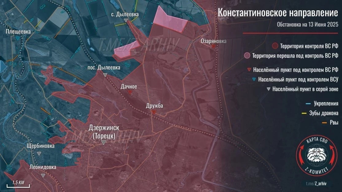 Западнее Торецка наши продвигаются по лесам южнее Яблоновки, а также пытаются продавить оборону южнее Александро-Калиново. В ближайшее время можно ожидать штурм этого мощного укрепрайона. На востоке от Торецка, в районе Дылеевки, ВС РФ провели разведку боем и выбили противника из опорного пункта. Ж/д станция в Дылеевке под российским контролем, а в самом селе ещё идут бои, сообщает Олег Царёв в своём Telegram-канале.