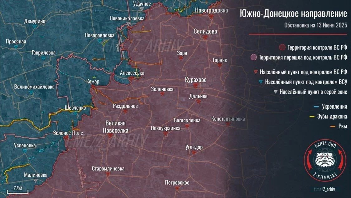 На Угледарском направлении Вооружённые силы Российской Федерации (ВС РФ), опираясь на Зелёное Поле, атакуют по направлению к Запорожскому и Темировке, сковывая резервы ВСУ в районе Комара, а также создают условия для ещё одного прорыва в Днепропетровскую обл. Восточнее Комара наши выбили врага из Запорожья и подошли к окраинам Ялты. Двигаясь дальше, наши выйдут в районе посёлка Толстой и перекроют «северное» снабжение группировки ВСУ в Поддубном и Мирном, к которым наши подходят с юга, от Комара. Севернее по фронту Минобороны подтвердило освобождение Зелёного Кута - села в 4 км к западу от освобождённого Богатыря и в 3 км к востоку от границы с Днепропетровской обл. При этом украинские части в районе Орехово-Новоукраинка-Андреевка вполне могут остаться в оперативном окружении.