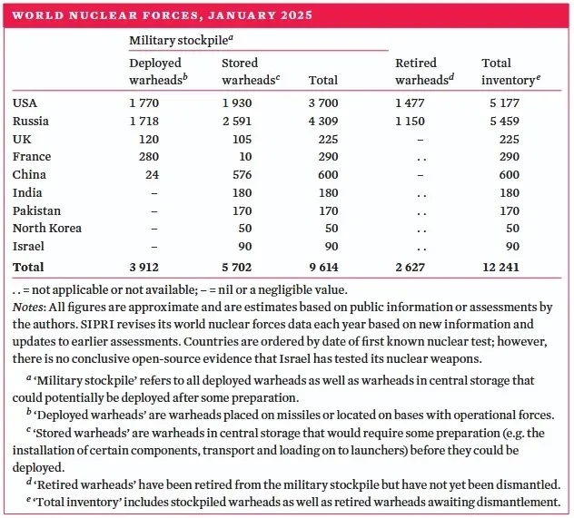 По оценке SIPRI, на начало 2025 г. все страны в общей сложности располагали 12241 ядерным боезарядом. Свыше 9,6 тыс. таких изделий предназначаются для развёртывания и применения. Не менее 3,9 тыс. зарядов развёрнуты на средствах доставки, тогда как прочие находятся на хранении.