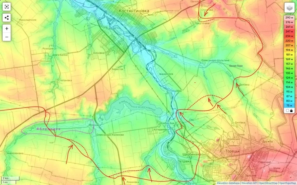 Сообщается, что западнее водохранилища ведутся штурмовые действия, направленные на вытеснение противника из Яблоновки, а севернее Романовки войска продвигаются к Катериновке.