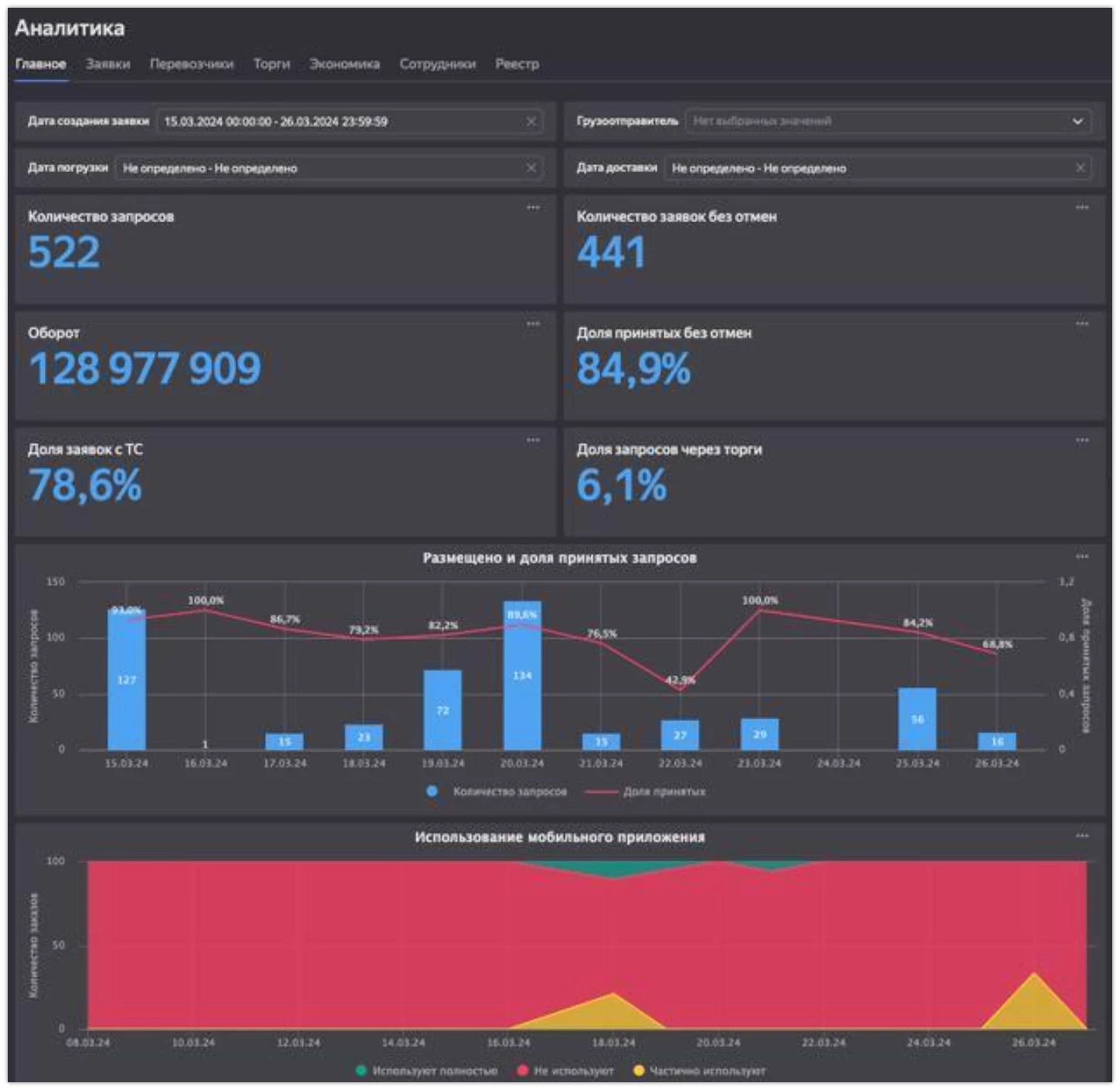 Ориентироваться в большом объеме заявок помогает обширный список фильтров. Здесь можно искать заявки не только по таким стандартным критериям, как дата создания, статус, дата изменения, но и по типу торгов, особым условиям, времени погрузки или локации. Например, найти заявки с погрузкой в Москве и выгрузкой в Самаре.