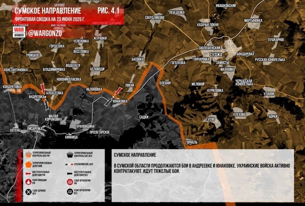 На Сумском направлении отбиты очередные попытки ВСУ вклиниться в нашу оборону в Теткинском и Гоушковском районах. Несмотря на провал каждого украинского наката, ВСУ с маниакальным упорством продолжают посылать свой личный состав на верную смерть. В Сумской области продолжаются бои в Андреевке и Юнаковке. Украинские войска активно контратакуют. Идут тяжёлые бои.