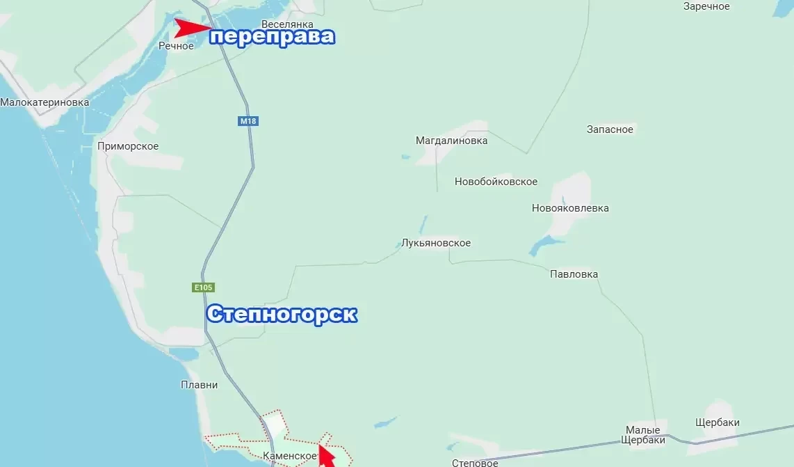 Для справки: от Каменского до Степногорска - 3-4 км. И снабжение гарнизона ВСУ в Степногорске может быть перерезано, если будет уничтожена переправа (помечена на карте) к северу от него - через реку Конка, в районе Панского озера - близ места впадения в Днепр.