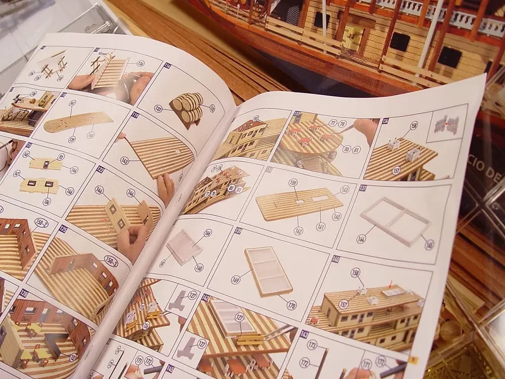 Инструкция включает более чем 200 фотографий, которые помогают на каждом этапе постройки модели, есть и перевод инструкции на русский язык с комментариями и советами. А вот фигурки людей в комплект, к сожалению, не входят. Ну и мебель, показанная на фотографии, тоже дана неокрашенными деталями. На взгляд автора, очень нереалистично выглядит и полосатая, словно роба арестанта, палуба из реек попеременно светлого и темного дерева.