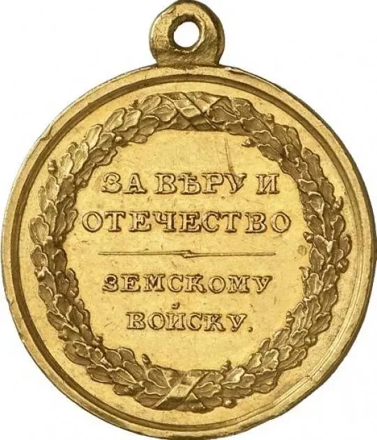 На реверсе медали были две надписи, разделявшиеся фигурной чертой: «ЗА ВѢРУ И ОТЕЧЕСТВО» и «ЗЕМСКОМУ ВОЙСКУ». Обе надписи заключались в дубовый венок. Там же