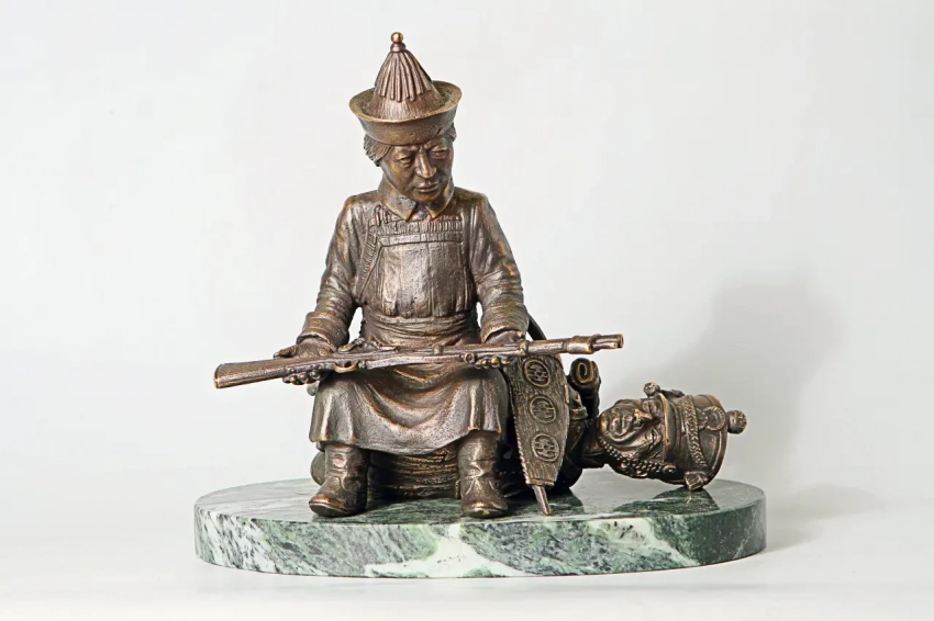 «Трофей». Башкирский воин, взявший в плен французского солдата, сидя на нем, рассматривает его ружье. Работа Г. Феоктистова