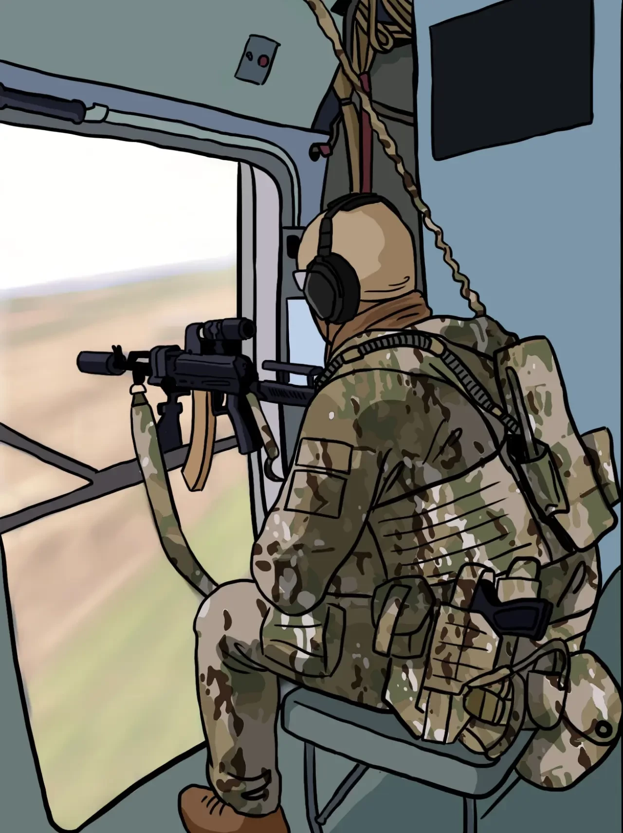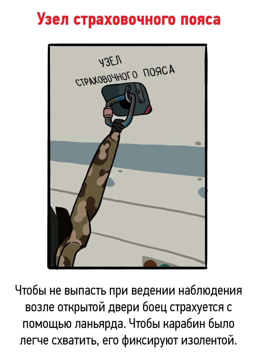 Незадолго до приближения к месту высадки возле открытой двери располагается еще один наблюдатель: его сектор – впереди по курсу движения. В случае обнаружения противника – уничтожить или подавить. По возможности в качестве первого магазина используют 45-зарядный от РПК. Если есть связь с принимающей стороной, уточняем координаты, препятствия, с какой стороны лучше зайти и характер действий противника. Место посадки могут отметить дымовыми шашками, ИК-маяком или лазерной указкой. Конкретный способ посадки зависит от тактической ситуации. Чаще всего эвакуация проводится по одному из трех сценариев: